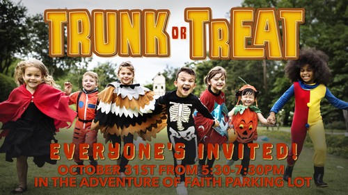 Join us for Trunk or Treat at Adventure of Faith on October 31st from 5:30–7:30 PM in the church parking lot! Youth can get involved by hosting a decorated trunk or pop-up tent, being a candy runner, or helping on the parking team. Sign up to host or volunteer here, or email nextgen@faithadventure.com. Let’s work together to create a fun, safe night for our community! 🎃