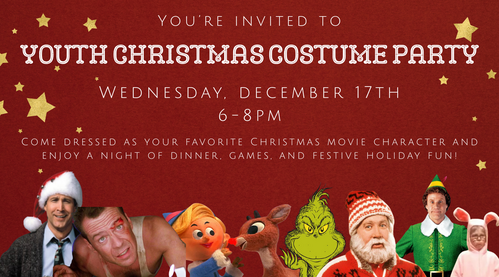 Get ready for our Youth Christmas Costume Party on Wednesday, December 17th from 6–8 PM! Come dressed as your favorite Christmas movie character (think Clark Griswold, Buddy the Elf, Rudolph, John McClane, or another festive favorite) and enjoy an evening of dinner, games, and holiday fun. It’s the perfect chance to celebrate the season, hang out with friends, and bring a friend!