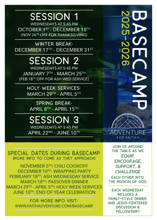 BaseCamp will have three sessions this year. We ask that as you prayerfully consider coming to any of the BaseCamp sessions, that you try committing to a whole session. We understand that there are occasional Wednesdays you may not be able to make it, but as we try to pursue genuine connections with one another and building relationships, it is helpful to be present consistently.