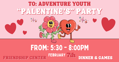 Adventure Youth is hosting a "Palentine’s" Party, a fun and welcoming evening centered on friendship and community. Join us on Saturday, February 7, from 5:30–8:00pm in the Friendship Center for dinner, games, and plenty of time to hang out and connect with friends. This event is all about building community, enjoying time together, and having fun, so bring a friend and plan to be part of a great night!